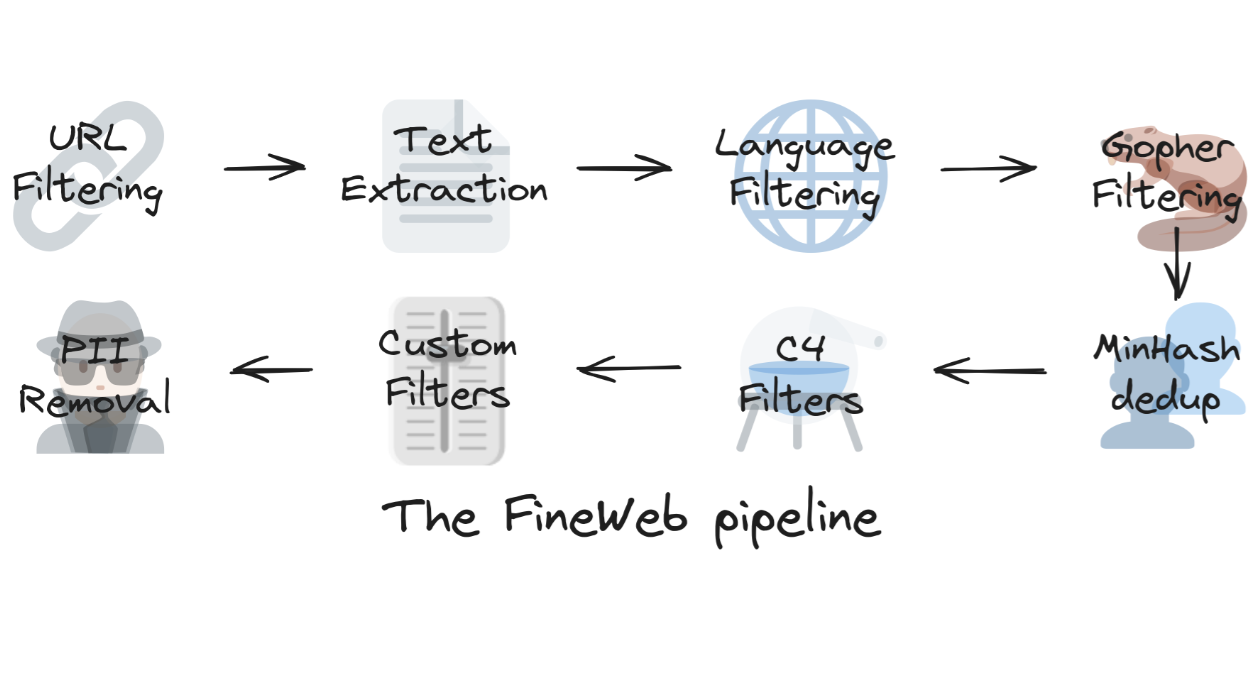 - Data Collection: Internet-scale datasets like FineWeb (15T tokens, 44TB).